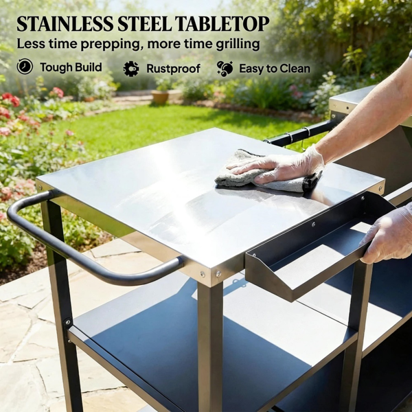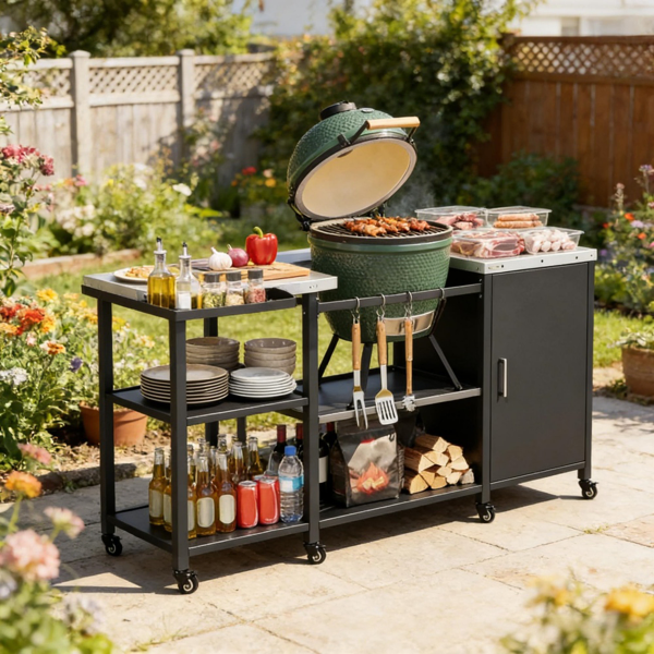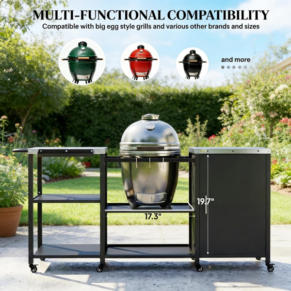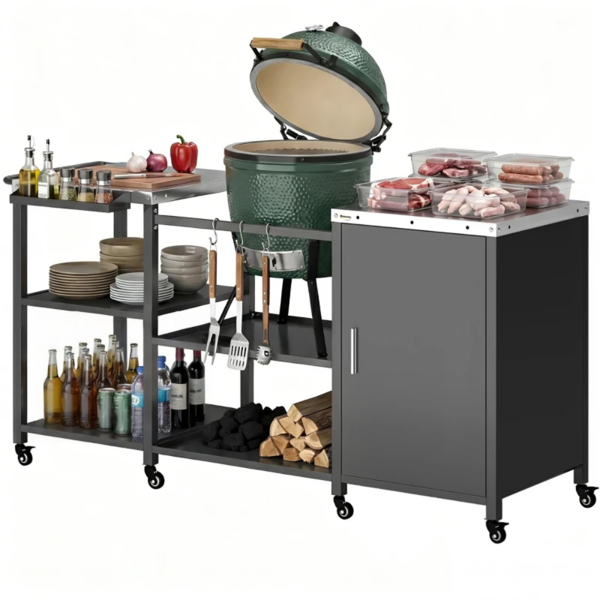 - Features large top on both sides with open and enclosed storage for organized grilling